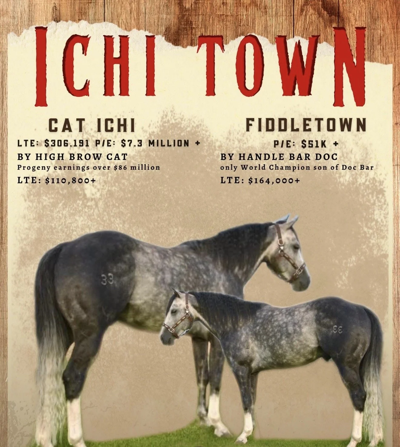 Ichi Town is a Striking gray Stallion with old-school bone and the kind of toughness it takes to hold up to your everyday ranch work. Sired by the legendary Cat Ichi and out of Fiddletown (PE 51k), Ichi Town represents generations of proven cow sense, athleticism, and durability.